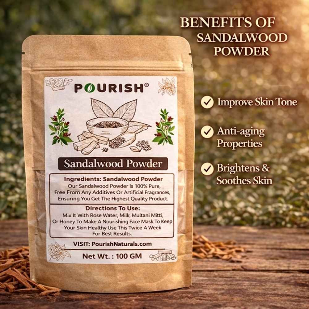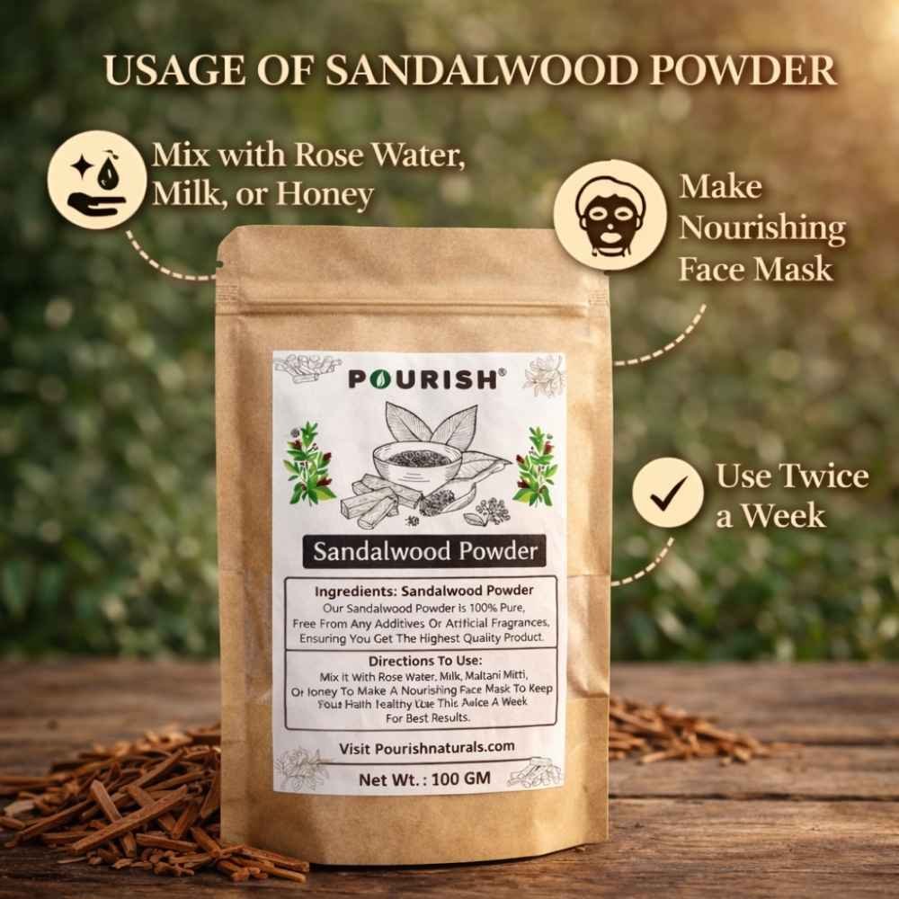 Pourish Sandalwood Powder is a Premium Quality, 100% Pure Chandan Powder specially crafted for skincare, face packs, and natural beauty routines. Sourced and processed with care, it delivers natural cooling, soothing, and skin-enhancing benefits without any chemicals or artificial additives.