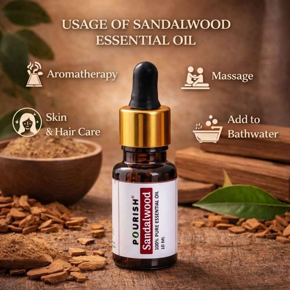 Pourish Sandalwood Essential Oil is a premium-quality, 100% Pure and Natural Oil derived from High-Quality Sandalwood. Known for its soothing aroma and therapeutic properties, this essential oil helps promote relaxation, improve skin health, and create a calming atmosphere.
